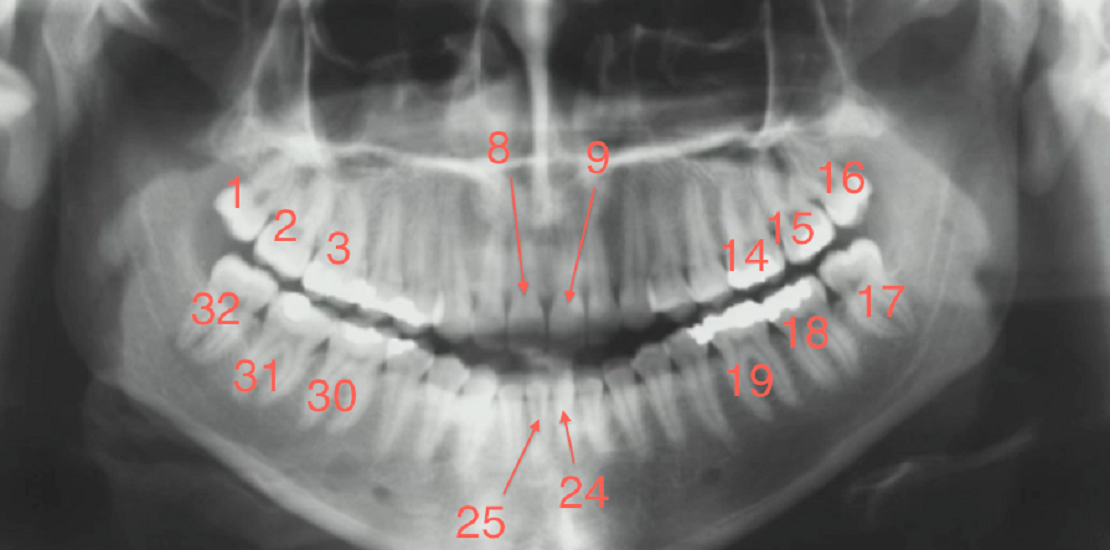 این عکس هر فک را به دو نیمه چپ و راست تقسیم کرده است. سپس شماره گذاری دندان ها برای هر نیم فک از دندان پیش یا ثنایای طرفی شروع می شود. از جلو تا آخرین دندان، به ترتیب شماره 1 تا 8 را به هر دندان می دهیم.